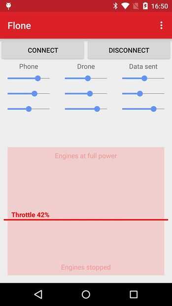 En lugar de utilizar la pantalla como un joystick virtual como el resto de aplicaciones, aplicación de Flone utiliza la inclinación de los smartphone para pitch, roll y yaw. Acelerador se controla con el dedo en la pantalla, en cualquier momento de que usted puede levantar el dedo en la pantalla de altura llevar a cabo. Armar y desarmar son botones de volumen.