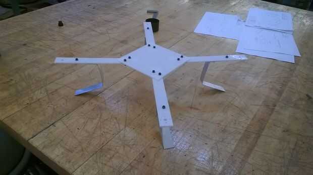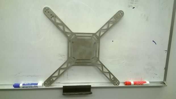 con cuatro 1" amplia los brazos que sobresalen de las esquinas. Los brazos sobresalen 8,75" con el fin de permitir la separación de los propulsores de 11". Los agujeros en cada brazo son cuatro orificios de montaje de los motores, un agujero para el eje de giro y un orificio de montaje para las patas. Se tuvo cuidado de que el diseño de toda la trama, será esta simétrica, como cualquier excentricidades causaría inestabilidad de vuelo. El marco fue diseñado para ser ligero y altamente solidaria utilizando un diseño de esqueleto con truss soportes a través de los brazos. El diseño fue elaborado en Solidworks y había fabricado usando el cortador láser.