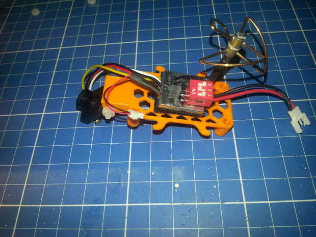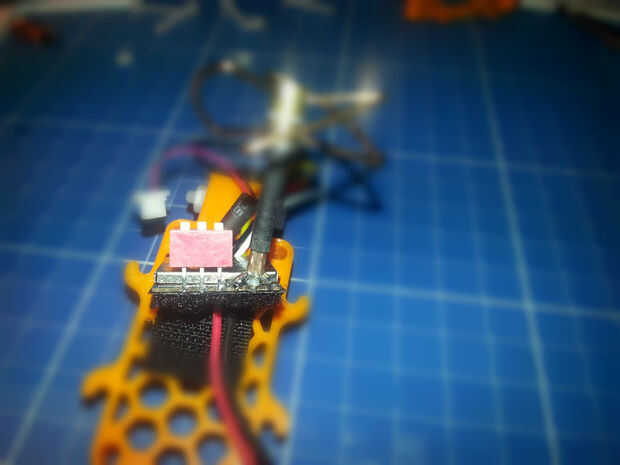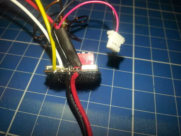 De la cámara, el cable amarillo es vídeo, y va a "VIN" (a diferencia de la FC, donde significa tensión en, aquí significa Video en). el cable blanco es audio, que puede conectarse a A6.5 pad, o se puede quitar en conjunto. los cables rojo y negro son, como siempre, los cables de positivo y negativo. me torcí en ambos conductores de alimentación para la vTX y los cables de alimentación para la cámara, porque era más fácil de soldar. todo rojo en un montón, luego de la soldadura a + cojín cojín de 5V, los All blacks en un manojo y soldadura para cualquier toma de tierra. Consulte el cuadro en LDM, como aquí ya tengo Velcro pegado ya a la vTX.