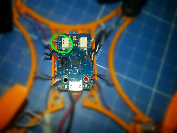 En la parte delantera derecha y trasera izquierda se soldadura motores de rotación en sentido antihorario (cables blanco y negro): cable al positivo, negro a negativo pad blanco.