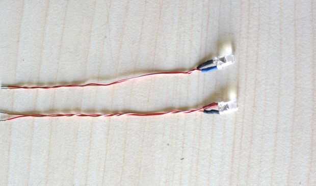 Los LEDs tienen un rojo lleva positivo y un cable negativo amarillo y bronce. Puede identificar el color de una inspección más cercana, parece que el encogimiento de calor del cable positivo coincide con el color del LED.