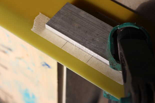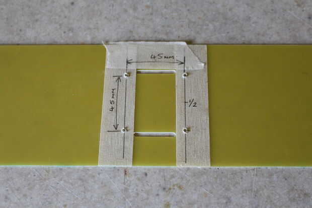 La hoja central principal es fibra de vidrio de 1,6 mm, se puede ver en la imagen dos primeros cómo he marcado y perforado los agujeros para los soportes de tubo de esquina y la Junta de control de vuelo central. En las otras 4 imágenes puedes ver cómo he cortar las ranuras en la hoja para permitir que la cinta de Velcro ser roscada a través de.