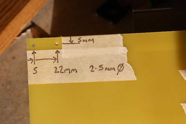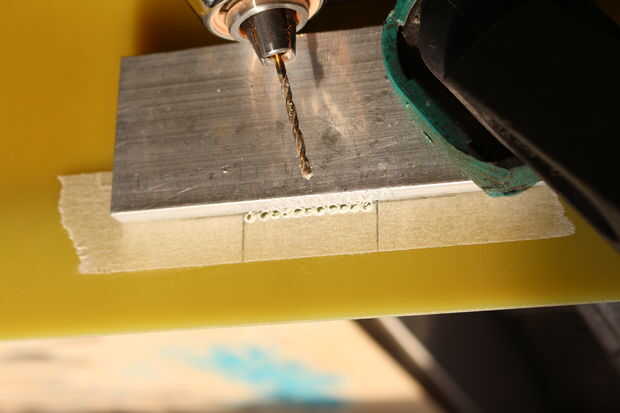 Su un método sencillo para cortar las ranuras, marcar el borde de la ranura en masking tape luego pinza un trozo grueso de aluminio y la fibra de vidrio (Banco de trabajo) luego me taladro de cadena con broca de 2,5 mm y luego taladrar la ranura usando un taladro de 3mm y finalmente limpiar con una lima de aguja.