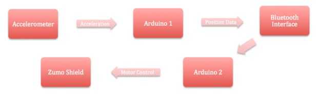 La imagen al principio de esta sección describe el flujo de datos dentro de nuestro sistema y muestra cómo se transduce datos con un acelerómetro para mover una silla de ruedas mediante bluetooth.