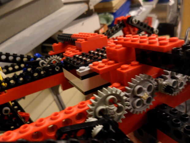 ¿2. recuerde los engranajes solo en el lado exterior de cada juego de piernas? Los estará apuntando hacia dentro (hacia ellos). Montaje de los motores (con los engranajes de la 12tooth adjuntados) a los travesaños y asegúrese de que los dientes de lo engranajes de malla.