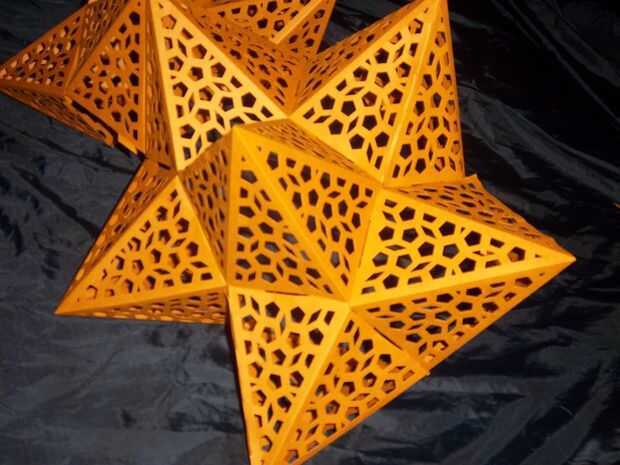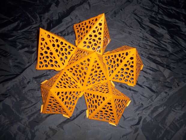 Conectar 3 de los 5 bordes adyacentes de las pirámides que rodean la pirámide superior, dejando medio floja la pirámide más alejadas de la parte inferior de la linterna. Estamos dejando esta pirámide suelta por lo que se puede obtener la vela luego.