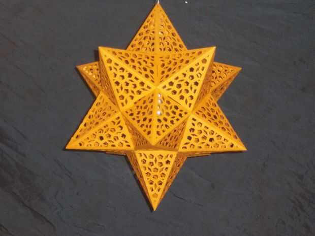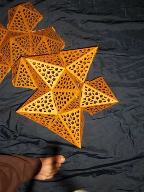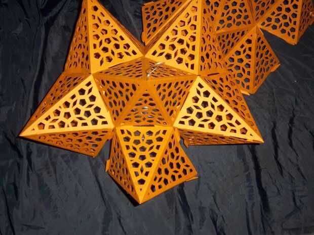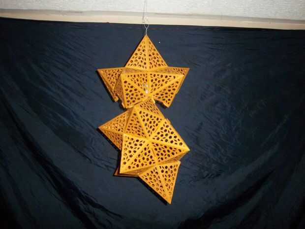 Ahora toma una pirámide suelta y hacer exactamente lo mismo que hiciste para la pirámide llena de velas, rodeándolo con 5 otras pirámides. Considerar esto en la parte inferior de la mitad de la linterna. Fije una de las pirámides alrededor de este grupo a una de las pirámides alrededor de la parte superior de la mitad de la linterna.