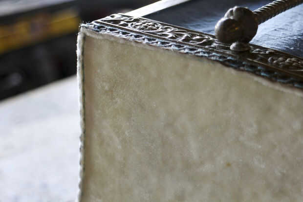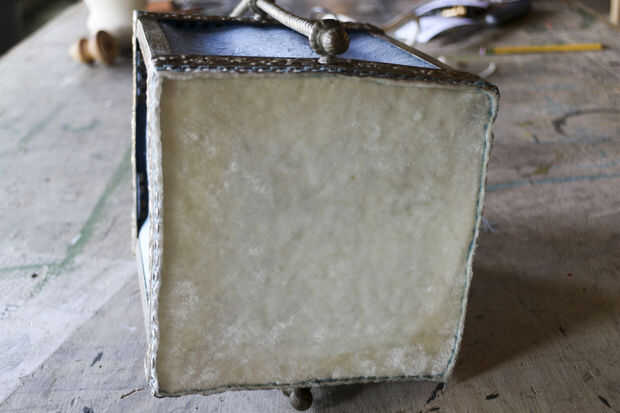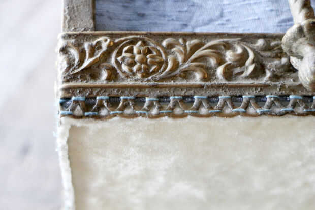 Encontré una pequeña muestra de grueso terciopelo blanco y había cosido a la parte inferior, al igual que yo había cosido la seda azul a la forma metálica.