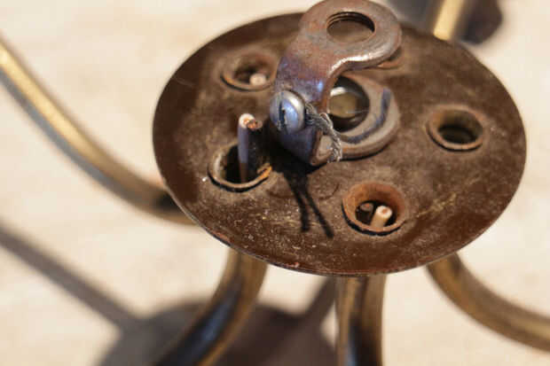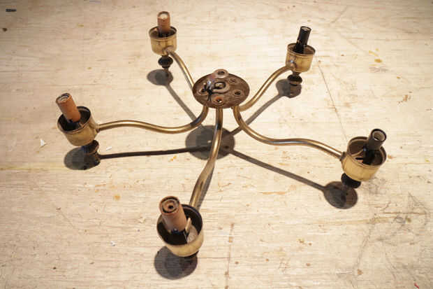 Me encontré con esta lámpara de candelabros de 5 puntos de la colección - estaba en forma bastante duro cuando lo encontré, los cables habían sido chatarra, bombillas había interrumpido de sus zócalos, había bichos muertos incluso en it... ugh.