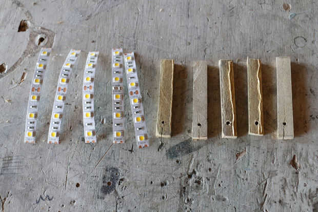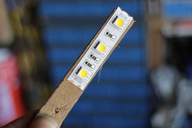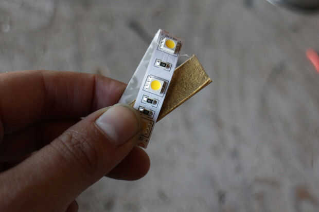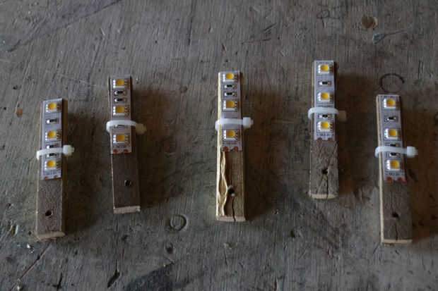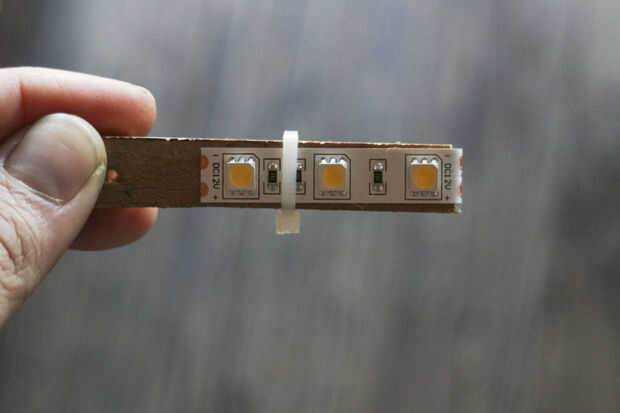 Fue capaz de encajar dos secciones de la tira de LED en cada trocito de madera y fija en su lugar con la parte adhesiva de la tira del LED y una amarra.