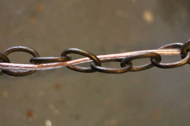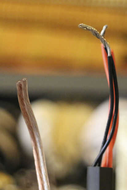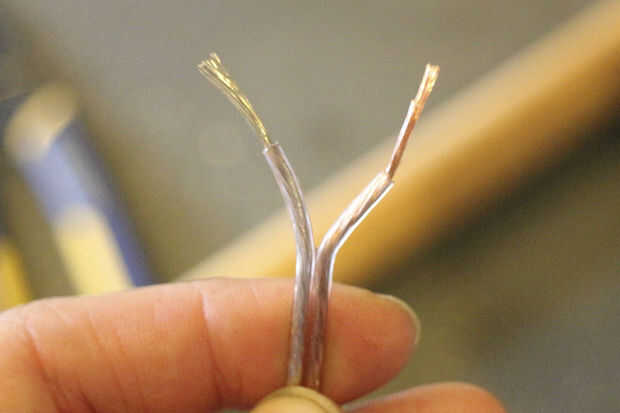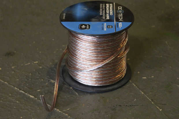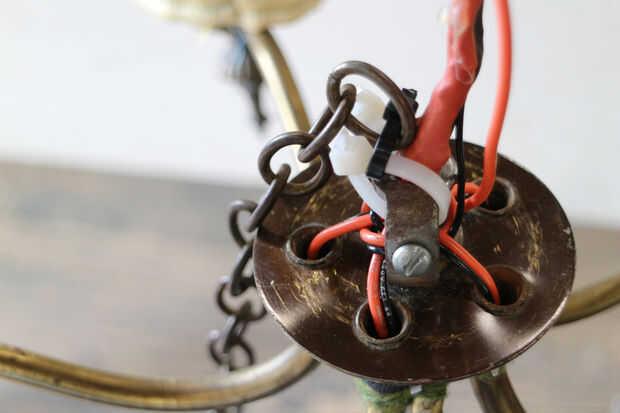 Tejió el cable del altavoz a través de la cadena de la luz y cubre el poco acoplamiento desordenada con una vieja pata de la silla. Ve muy bien.