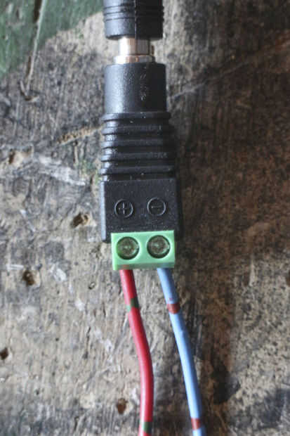 El conector de barril que viene con el kit es muy bueno. Nunca había usado uno similar antes, pero decidí que ya era totalmente rad. Tiene dos terminales marcados para insertar los cables en y luego abrazaderas en ellos. Genial manera de hacer pruebas rápidas.