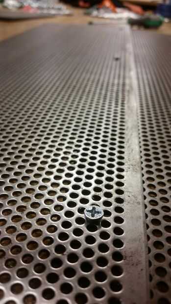 Superpuesto las chapas un poco para que se vea como tradicionales de madera de los listones y les atornillan. 2 tornillos al techo mitad fue suficiente para mantener bien juntos. tornillos de #6 se pueden encontrar en cualquier ferretería y encajan perfectamente los orificios.
