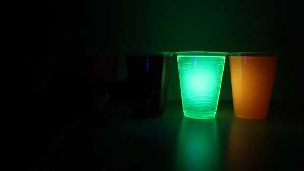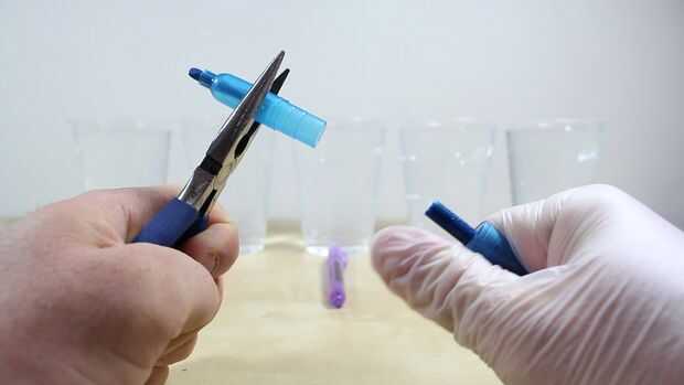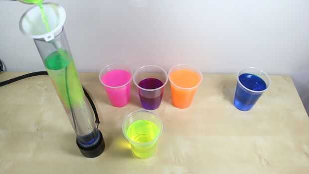 Utilizaré el paquete surtido de marcadores para hacer brillar intensamente el líquido de la luz. Quitado los tubos interiores de los marcadores que se mantenga el tinte y remojar en tazas de agua por aproximadamente una hora. Una vez que la hora fue que apreté a tanto tinte como pude y me quedé con estos líquidos muy coloridos que brillan brillante cuando está expuesto a los LEDS ultra violetas.
