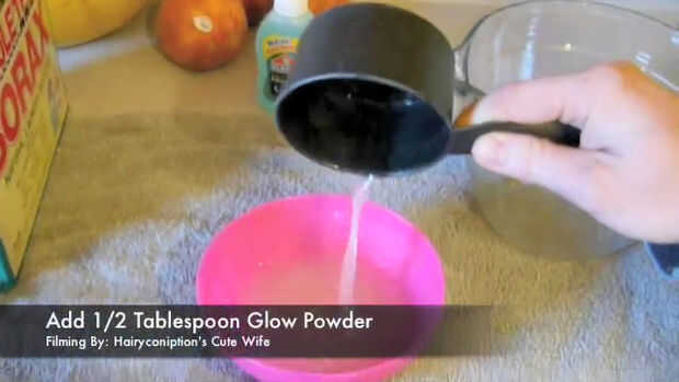 2. Agregue 1/2 cuchara de mesa brillo polvo bórax y agua. Si no tienes polvo de brillo puede Agregar 1/2 cucharada resplandor en la pintura oscura.