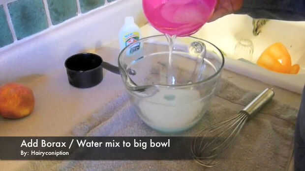1. Vierta la solución de bórax en la taza de cristal de Poly Vinyl Alcohol solución. Agite el recipiente como viertes para asegurarse de que obtener el polvo de brillo que se ha instalado en la parte inferior de la taza hacia fuera.