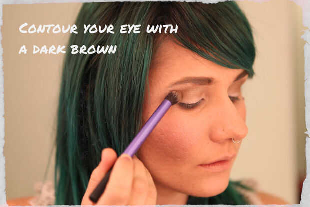 Usando un cepillo pequeño pliegue o un cepillo pequeño sombra de ojos redondeada (si prefieres), añadir un marrón oscuro, caliente a sólo el pliegue exterior del ojo. Arrastre el color en la esquina exterior de su tapa en forma de ojo de gato leve.
