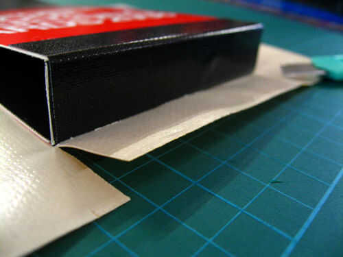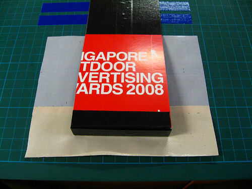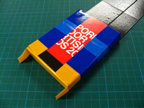 Lentamente Levante la pieza grande de cinta adhesiva y coloque la caja de lápiz en la parte superior se coloca aproximadamente en el centro (Foto 2) 11cm