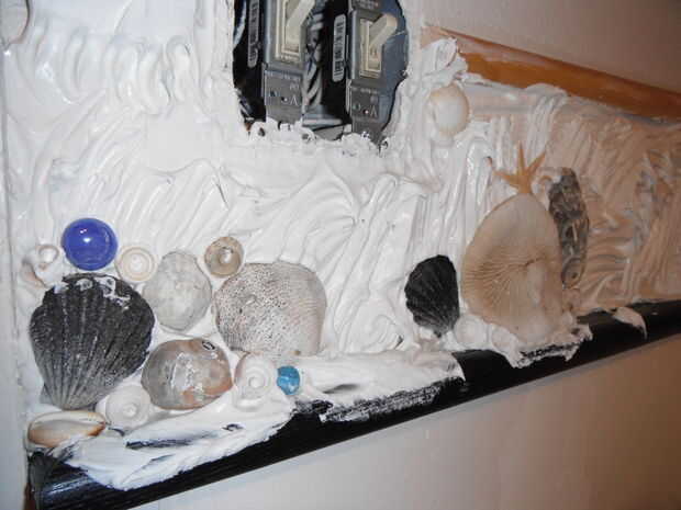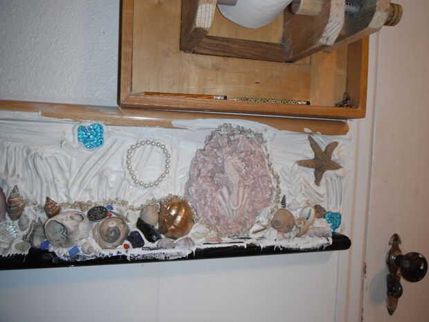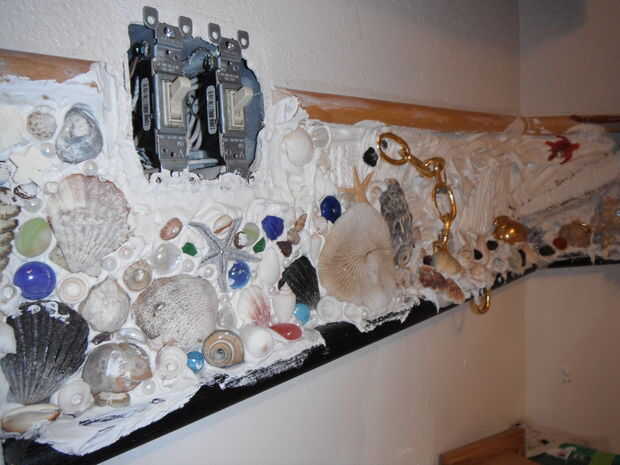empiezo colocando conchas y otros artículos con temática mar curioso en un patrón agradable y poético. Agregar brillante color abalorios y joyas hacen "POP" cuando haya terminado.
