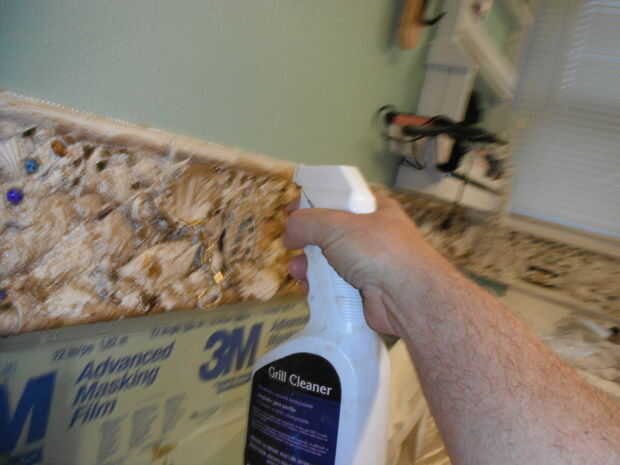 Dar la pintura un par de días para secar y luego pasar en las manchas con tinta para madera de su elección usando un cepillo pequeño. Me gusta usar la mancha como si estaba sombreado de objetos en una pintura de naturaleza muerta. Antes de que la mancha se seque limpiador una niebla de la ventana para dispersar las manchas y suavizar los bordes de las zonas oscuras.  PROTEJA SIEMPRE LA ONU PREVISTO ARES CON PLÁSTICO Y COLOCAR LA ROPA.