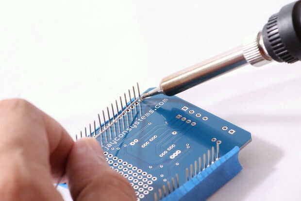 Para hacerlo más fácil, soldar un perno en cada uno de los encabezados para que pueda quitar la cinta. Una vez que la cinta está desactivado, puede comprobar la alineación de las cabeceras antes de soldar todos los pines en.