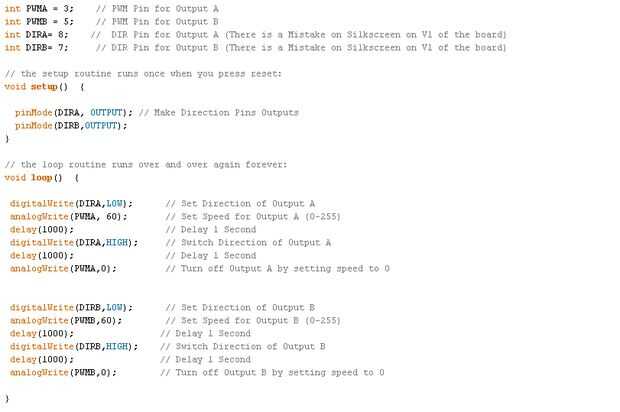 Ya hemos escrito algo de código para este escudo que puede descargar aquí. Incluye el código para controlar los canales, así como un motor bipolar paso a paso. Ir adelante y abrir el dibujo Dual_DC_Motor.ino.