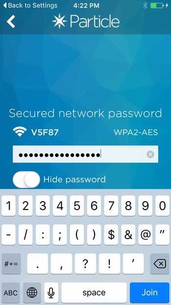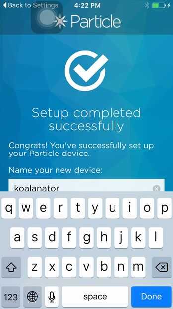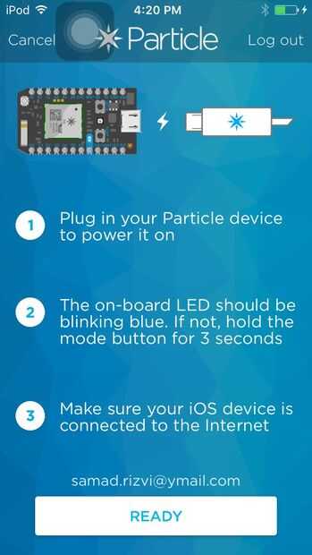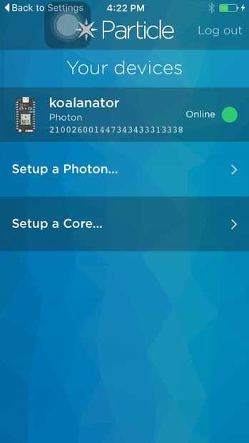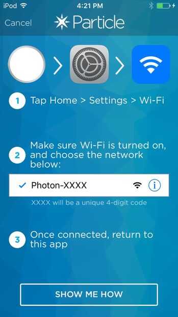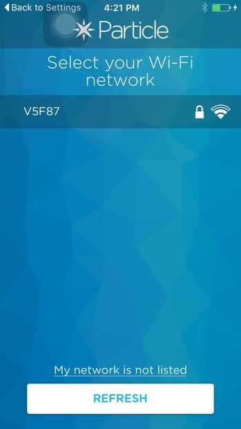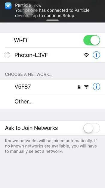 Cuando dice conectar al fotón vaya a configuración y haga clic en red del fotón. Una vez conectado se consigue usted una notificación diciendo que ha conectado. En la aplicación debe seleccionar su propia red e introduzca la contraseña. Una vez hecho esto configurando la partícula ahora está conectada a las redes de inter.