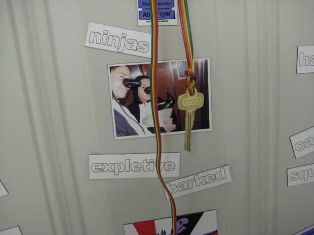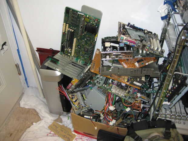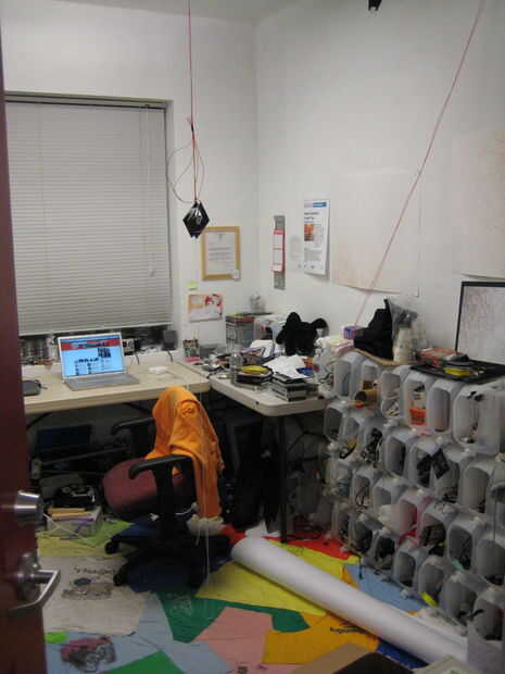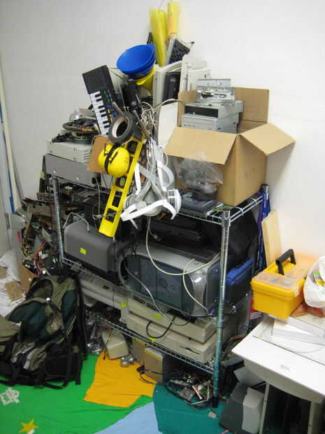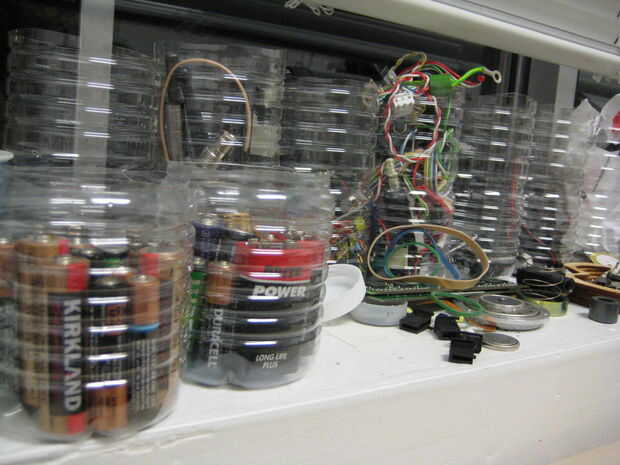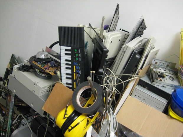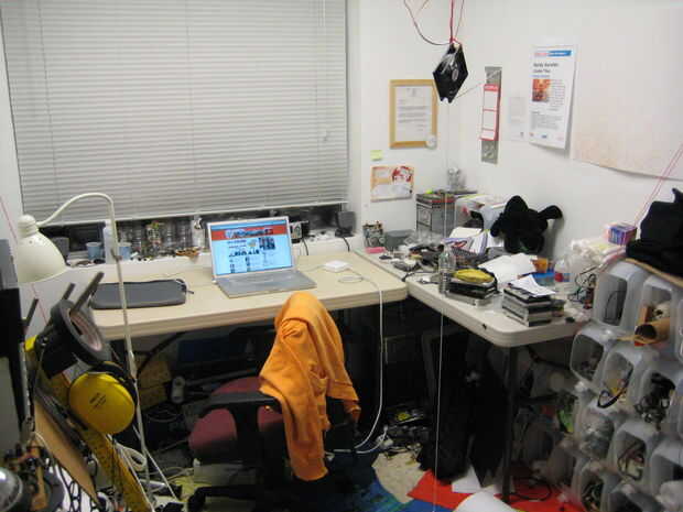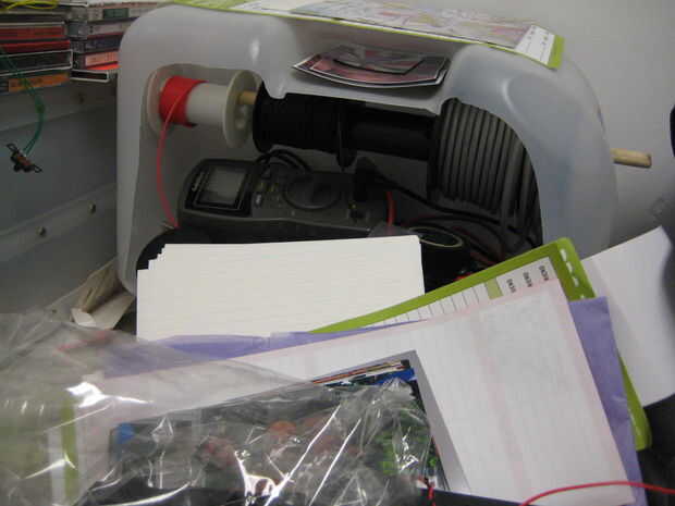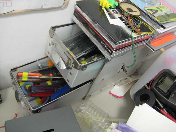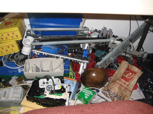mi taller es un gran lío de silbatos, campanas, motores, computadoras, escáneres, máquinas de fax, circuitos, micro controladores, bombas de agua, dinosaurios de plástico, peluches, garabatos, cables, cadenas, cuerdas, destornilladores, equipo de seguridad, botellas de agua, camisetas, baterías sentía, medio, altavoces, tornillos, resortes, gomas, acrílico, tomas de teléfono, PVC, papel, teclados, teclados, teclados y un sombrero del oso de peluche con ojos de LED. Creo que me olvide de algunas cosas de la lista. ¿Qué están buscando? Si puede caber cómodamente en una jarra de agua de dos galones, probablemente tengo.