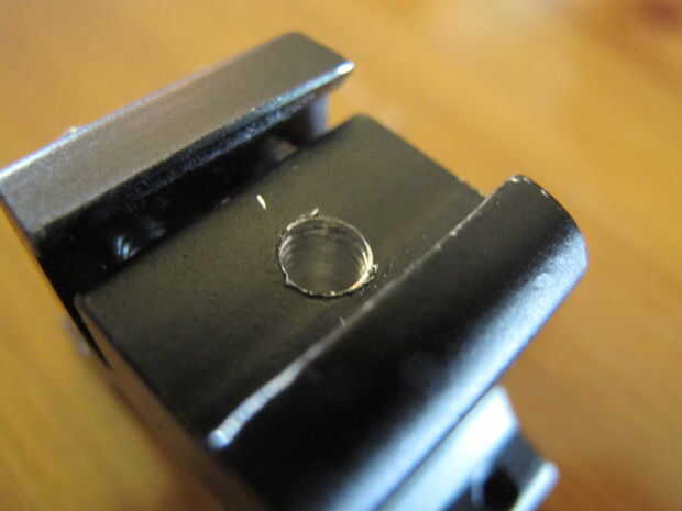 Ejecutar la toma de 10-32 a través del agujero. Estos anillos de alcance de aluminio fácilmente fueron intervenidos con el grifo montado en un taladro.
