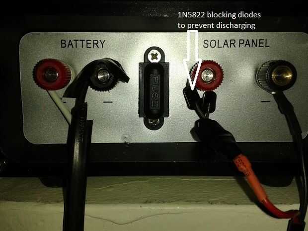 Un experimento que hice fue simplemente añadir un diodo de bloqueo en la parte posterior del controlador de carga. Inicialmente coloqué el diodo del lado de la batería pero basado en las recomendaciones de "evilmunkey", el diodo debe ahora poner en el lado del panel solar. El diodo que estoy usando es 1N5822 que pasa a ser en mi caja de herramientas, así que supongo que muchos otros diodos funcionaría así. 1N5822 puede manejar 40v 3A para que dos de ellos utilizar en paralelo para asegurarse de que puede manejar la corriente desde el panel solar. También asegúrese de que el plomo del cátodo de los 1N5822 debe conectarse al lado del regulador de carga mientras que el ánodo debe ir al lado del panel solar. Anteriormente experimenté con poner el diodo en el lado de la batería pero me preocupaba que podría sobrecargar la batería así que ahora el diodo está en el lado del panel solar. Después de la modificación, mi batería está cargada mejor.