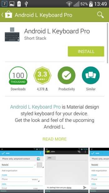 Este paso es opcional. Si usted busca l Android en Google Play, aparecerán un montón de aplicaciones. Por ejemplo: Calculadora de L Android, Android L teléfono y muchos más. Pero el mejor es el Android L teclado Pro, es gratuito y no tiene anuncios.