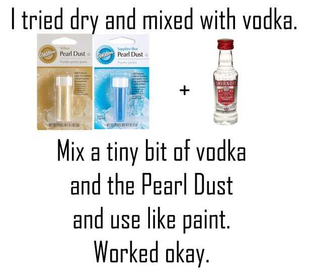 En varios utilicé el seco polvo de perla de Wilton, y algunos lo utilizado mezclado con un poco de vodka. El alcohol se evapora en un corto tiempo después de aplicado, y lo hace donde puede utilizar el polvo de perla como una especie de pintura.
