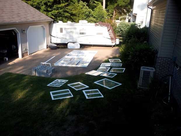 Aquí puedes ver algunas de las ventanas enunciadas el patio. Esto no era malo pero fue mucho tiempo pero no se preocupe, no estaba en un apuro. Empecé haciendo un 8' x 8' marco cuadrado con 2 x 4. He utilizado 16P clavos galvanizados para esto. (no hay pistola de clavos para este chico) Por cierto, toda la madera para este proyecto es presión, toda la madera fue preparada utilizando Kiltz exterior. y pintado con pintura blanca semibrillante exterior de Behr. Una vez que fue clavado junto empecé a armar el rompecabezas. Mi objetivo era para caber tantos windows dentro del marco como sea posible y para que sea uniforme. Una vez satisfecho con el look cortar y puesto en la estructura de la sección. Con cuidado clavó el encuadre, (no windows) en lugar. Con cinta de enmascarar etiqueta las ventanas con una letra, número y sección. 1 LF (delantera izquierda) entonces quitar las ventanas y almacenado en un lugar seguro. ¿Nota especial: Recuerda que te dije cómo viejo y espalda y luego cuando vierte vidrio tenía un contenido de plomo? Bien, con todas las ventanas dispersadas alrededor mientras yo estaba seleccionando las que caben, yo accidentalmente mal caminó y caminó en un panel completo de uno. 180 lbs en una ventana hecha hoy se rompería. No que el bebé, no podía creerlo. Estoy muy contento porque era más grande. "Siguiente diapositiva por favor"