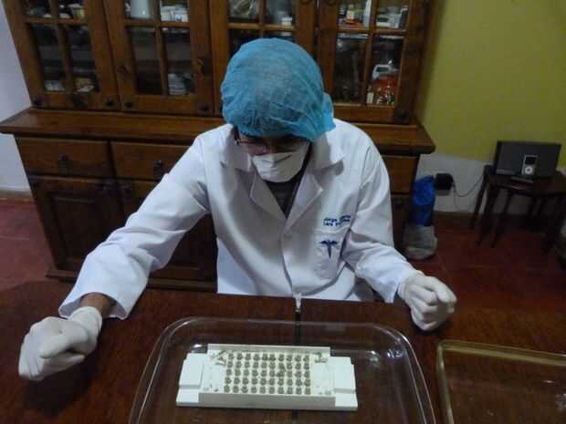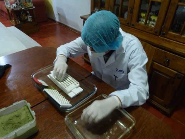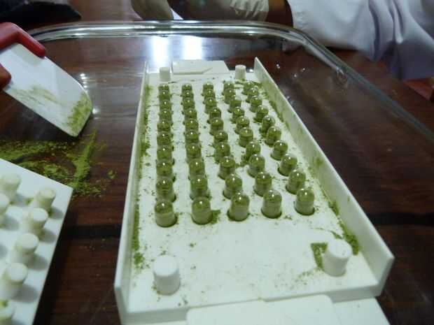 3. verter las hojas en polvo en las cápsulas vacías. Para producción en masa, puede comprar una capsuladora para automatizar el proceso de llenado. Por métodos manuales, asegúrese de desinfectar las manos con alcohol.