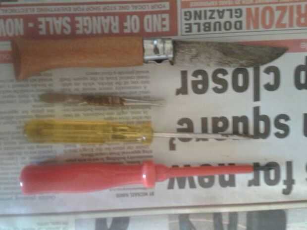 Utilizan herramientas pequeñas Philips y destornilladores de hoja plana, par de pinzas de la ceja (alicates de nariz hubiera sido mejores) un cuchillo de bolsillo y algunos fuerza bruta y la ignorancia.
