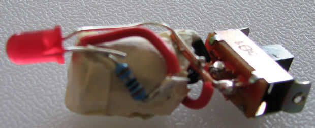 Primero la soldadura de los cables al interruptor, asegúrese de obtener una buena conexión con los conductores. Luego suelde la resistencia para el LED. Esto es un poco más difícil de conseguir soldados, quizá quieras probar y usar un tercer y o algún tipo de abrazadera. A continuación, suelde el LED interruptor. Entonces finalmente, soldar los cables de la batería a la resistencia y el interruptor.
