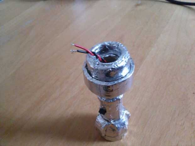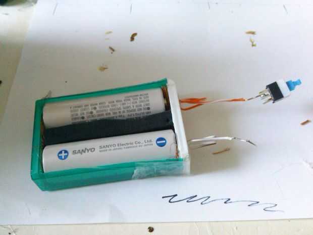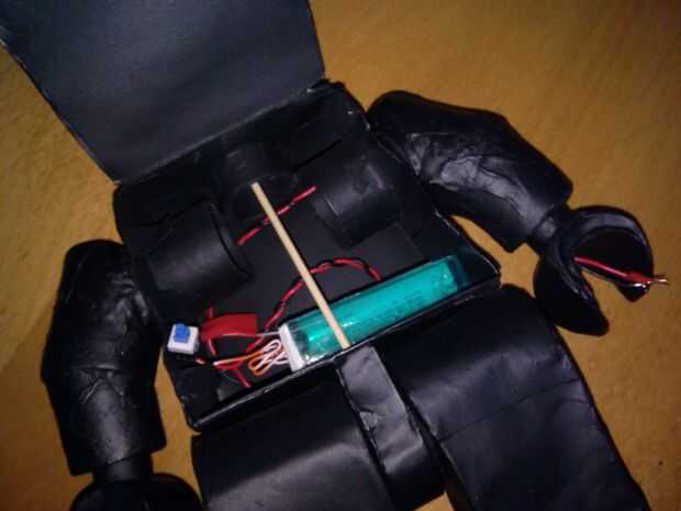 Portapilas con interruptor entra en el cuerpo y el brazo a través de los cables y la mano donde están pegando hacia fuera, esperando a ser unido al sable de luz.