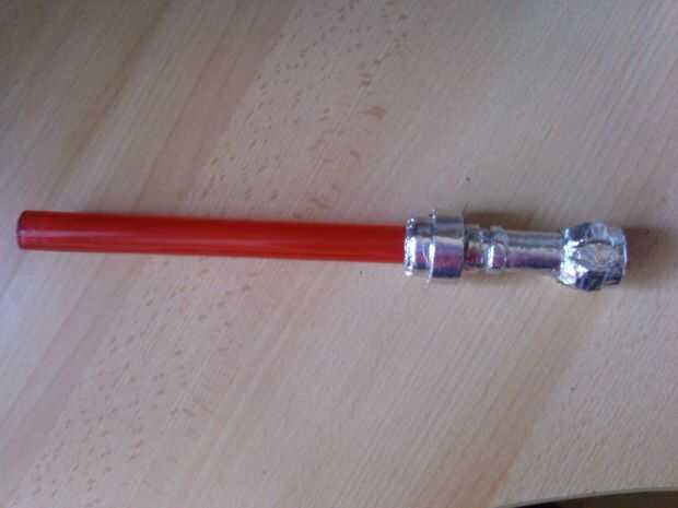 Sable de luz es simplemente un tubo con varios tubos pegados en la parte superior en capas. Todo está cubierto de cinta adhesiva de aluminio. Y el "laser" de papel rojo rodado en tubo y asegurado con cinta adhesiva.