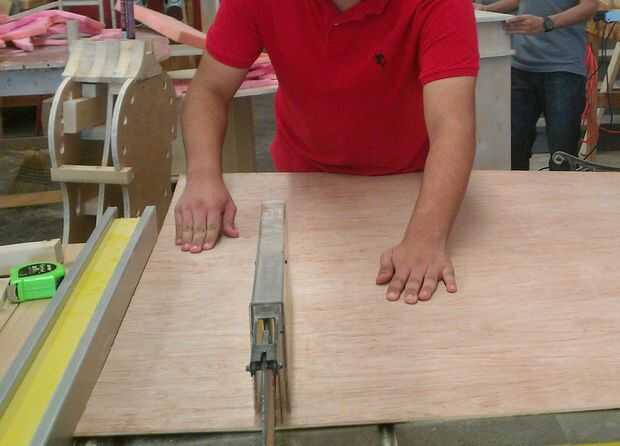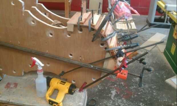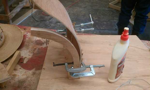 Primero cortar unas tiras con la anchura de 8-3/4" de la hoja de madera contrachapada, estos eran las costillas. Para obtener la longitud de cada costilla individual, corrí una cadena a lo largo del borde del molde. Puesto que todos los bloques de la esquina tenían 90 grados ángulos, cada costilla se cortó con un ángulo de 45 grados donde estaban pegadas para tener una junta limpia. Entonces comencé el tedioso proceso de doblar las costillas. El truco a esto era mojar la tira de madera contrachapada con un atomizador y caliéntelo con una pistola de calor mientras aplica presión con las pinzas. Pequeñas tiras de madera fueron utilizadas junto con las pinzas para doblar uniformemente las costillas mientras que también les impide dejar muescas en las costillas. Cuando las nervaduras se seca finalmente aflojada a sólo para encontrar que las costillas no conserva su forma bien, así que para solucionar esto remonta los lados del molde en lo que quedaba de la madera contrachapada de 3/4 para hacer los forros. El plan era hacer las guarniciones de las costillas lo suficientemente gruesas como para forzar las costillas en forma una vez que estaban pegados en el. Estaba un poco seguro de si funcionaría, pero lo hizo y conservan su forma sin problema.