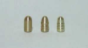 Estas son balas 357 pulgadas después de la partida; las balas de bronce de tres.357 pulgadas son las longitudes del mismo, sin embargo el cannelures han reducido el peso de los dos a la derecha. El de la izquierda es 130 gr los dos a la derecha son 110 gr.