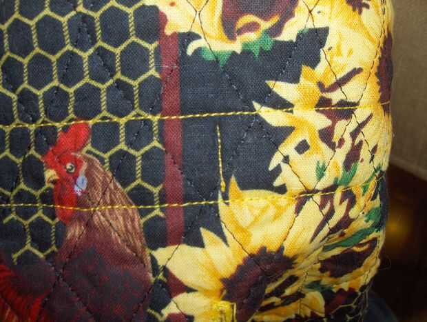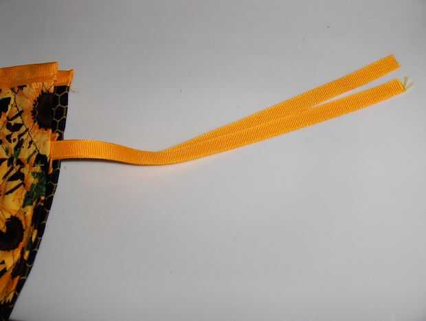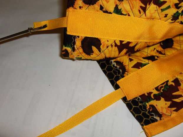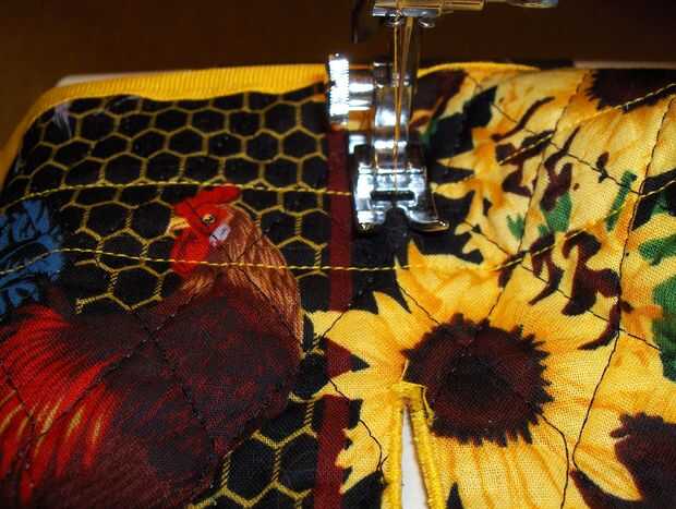 En el borde de la frente al centro de la acogedora (arriba y en línea con su pico de ojales de apertura), coser verticalmente a través de la conexión cinta y cubierta, para garantizar el empate en el lugar para que no tire cuando ate la cinta alrededor del cuello de la jarra de té [fotos C y D].