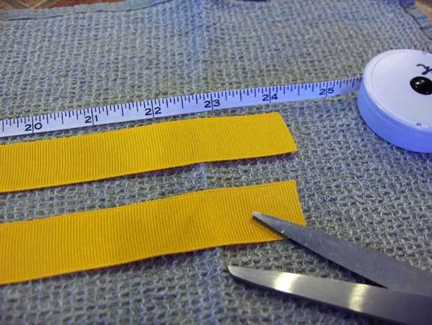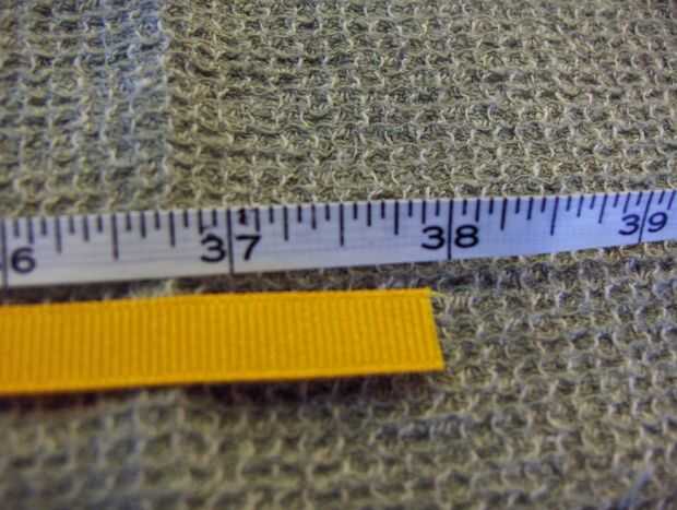 -Cortar otro trozo del 1" grosgrain, una pieza que también es 24" de largo. [Ver foto B]. Ponga a un lado. Más tarde será planchada en medio, lo largo, para formar un corte doble en.