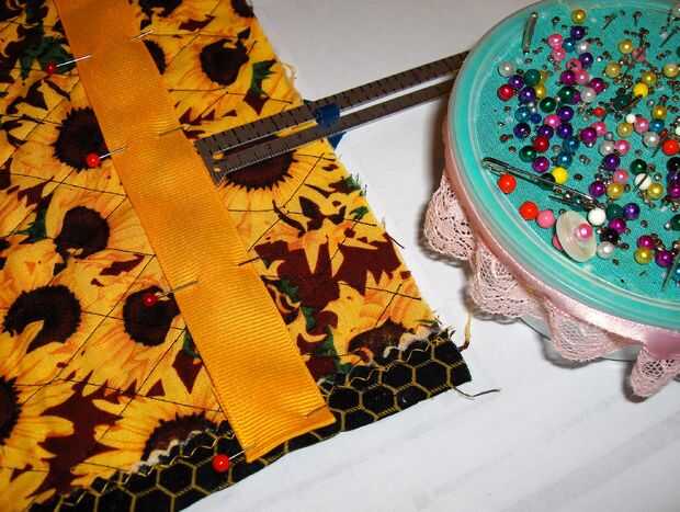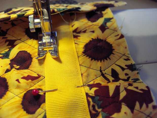 Colocar el borde superior de la cinta 1½" desde el borde superior, corte el tubo de tela, prender la cinta firmemente en su lugar. Sugerencia: Utilizando un dobladillo calibre funciona muy bien para esto, para que el borde de la cinta sea equi-distantes desde el borde superior de la acogedora, todo el camino alrededor. [Ver foto A].