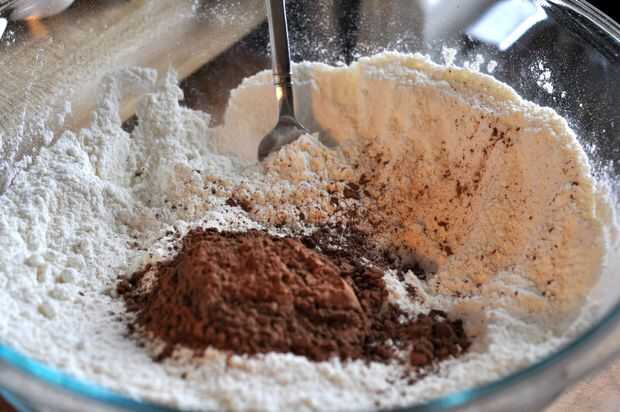 4. Añadir la harina, la sal y el cacao a la mezcla húmeda y revuelva hasta que quede mezclado. Traslado a la bandeja de pan preparado. Hornear por 45 minutos o hasta que un palillo, éste salga casi limpio. No necesitas hornear esto para terminar la cocción todavía!