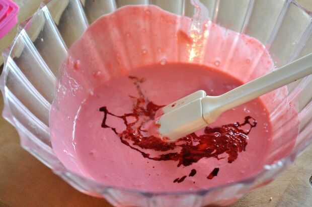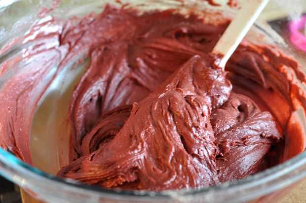 3. agregar la crema agria, suero de leche, vinagre y colorante y mezclar bien.