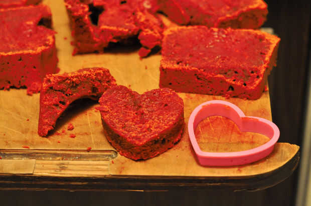 3 cortar el pastel de terciopelo rojo frío 1/2 pulgada rodajas y usar un cortador de galletas para cortar formas de corazón de las rebanadas. Coloque las piezas de recorte boca abajo para que no vuelque. Más uniformemente corta las rebanadas, mejor el efecto de corazón se asoman a través de la torta.