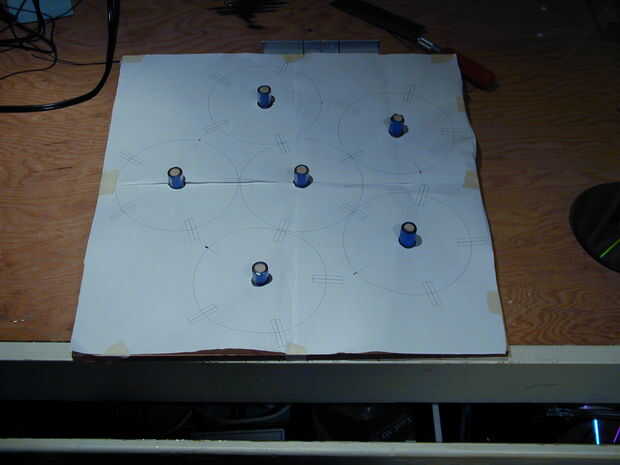 La idea básica de cada mitad, es colocar un CD en el centro rodeado por otras 5 para que las bisagras se pueden pegar con precisión y sencillez. Usé 6 "clavijas" en un 2' por 2' pieza de plástico o madera contrachapada. Perfore un agujero de 3/8" en el centro y otras 5 en exactamente separadas 72 grados y 4 13/16" del centro. El diámetro de centro del CD es de 9/16". Esto no es un tamaño común así que mi solución era hacer las fichas de centro de 3/8" pasador de 3/8 ID claro tubo Tygon se deslizó sobre él. Usted puede conseguir en cualquier ferretería. Utilizar un programa CAD para poner hacia fuera, pero también se puede construir sobre el papel con un compás y un transportador. Exactitud es importante!