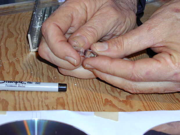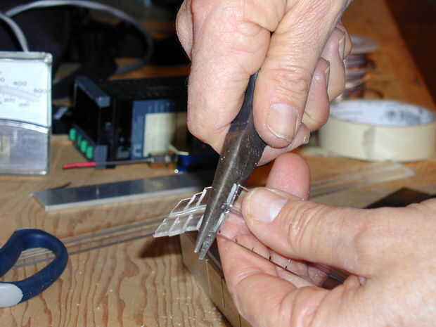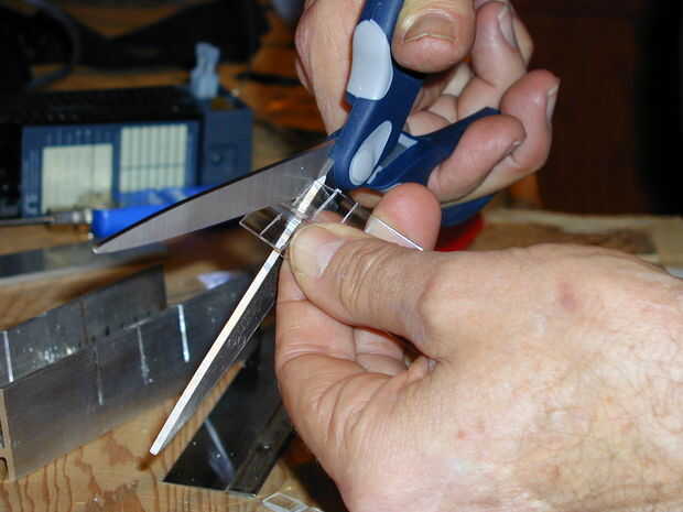 3. Observe, después de ajustar la bisagra no no separará completamente porque el centro es flexible (lo que queremos). Utilice unas tijeras y corte gratis como se muestra.