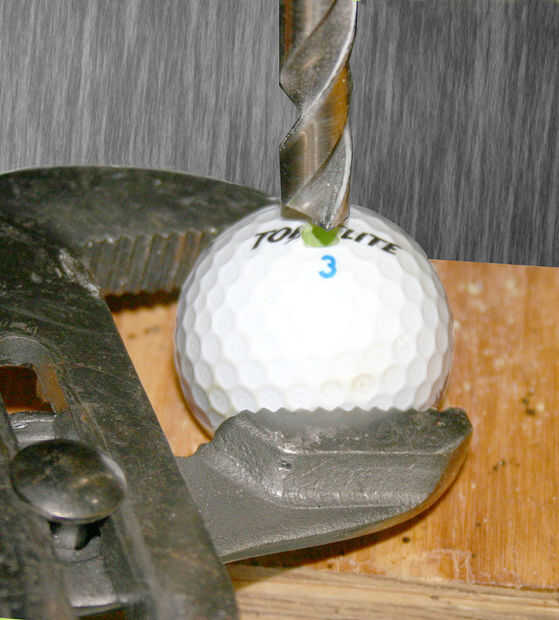 Reposar la bola en el agujero en el tablero. No debe mover alrededor. Si lo hace, perfore el orificio un poco más. Con su pequeña broca (yo usé 1/4"), perfore un orificio piloto en la pelota. Había perforado eaisly y sostuve con mi mano. Si trata de girar, puede mantener con unos alicates.