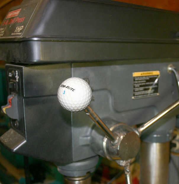 Tornillo de la bola en el mango. Entonces Apártese y admirar su trabajo. Lo a solucionado dos problemas. El taladro tiene un mando nuevo y nunca más perderás la pelota. Esto no garantiza que el resto de tus pelotas de golf podría empezar a 'portarse mal'. Que tenga que hacer botones más.